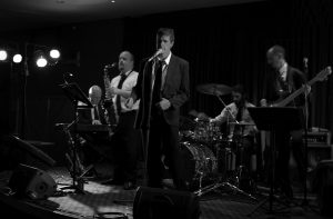The jazz band ‘Groove Casino’. Nikk on vocals (centre), Paul on bass (right)